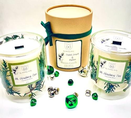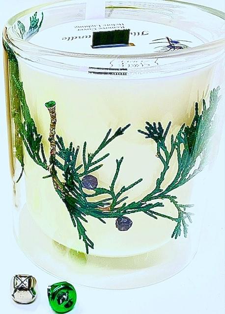 Wow! This is the epitome of the spirit of Christmas! Juniper sprigs enhance the walls of this double glass candle and give off a light scent of real juniper. Paired with our green wood wick and 2 perfect scents for the holidays, you can add a matching holiday tube box to this warm and unique candle!