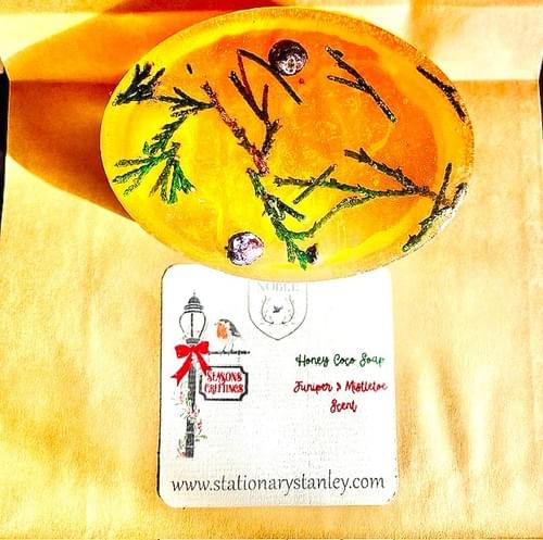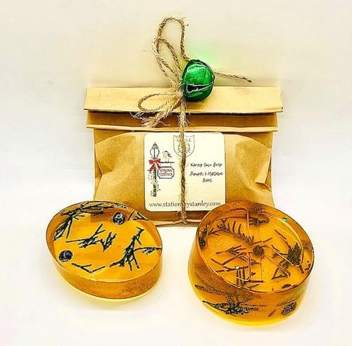 $7.50These darling soaps in a cute bag with a jingle bell & eucalyptus sprig (not shown) adornment; are created with 2 Holiday scents! Juniper & Mistletoe and Candy Cane Sundae! Oval and round in shape, they are embedded with actual juniper sprigs and berries and colorful wildflowers, matching with its fragrance! Want a larger soap? Choose the Peace on Earth or request our spa soap (extra-large) as a custom order! These are a must for stocking stuffers or to tie on the top of a gift! Soap accessories are a great add on too! And there's a few items under $5.99! Now that's a special gift :)