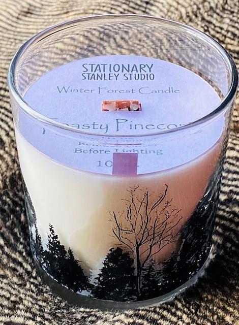 This is a sweet 11 oz. candle with a black and white forest scene. A great gift for anyone who loves the outdoors, has a cabin/ski home and loves getting cozy with candles after a long day of snowshoeing, skiing or any winter sport! Paired with our clean burning wood wick and a surprise scent! Tired of the holiday smells? This is an all year 'round fragrance and so good! It comes in a hand painted burlap bag with a snowman, that is just adorable! You can't go wrong! Only 1 left.